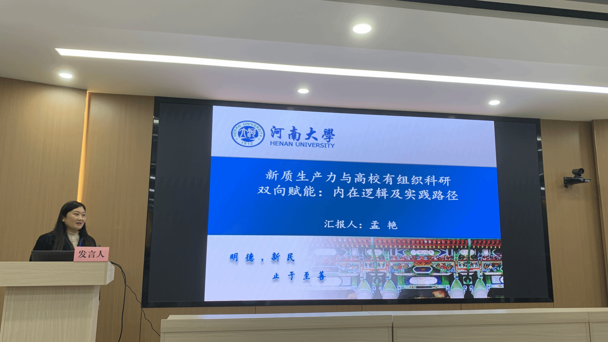 10月25日下午分论坛,孟艳做了《 新质生产力与高校有组织科研双向赋能:内在逻辑与实践路径》专题报告。她分析新质生产力对高校有组织科研理念、目标、发展模式和治理等的要求,而高校有组织科研推动新质生产力的劳动者、劳动资料和劳动对象高质量发展,并在此基础上提出高校应树立开放多元的治理理念、建立多样的组织架构、创新与高校有组织科研相适应的评价体系等实践路径,促进新质生产力发展。