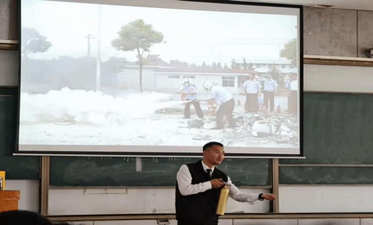 讲座开始,教员赵超磊结合校园火灾典型案例,图文并茂地剖析了火灾发生的原因、特点及危害。针对校园内易发生火灾的不同地点,他详细讲解了火灾预防的关键要点和火灾发生的处理措施,包括电器使用规范、电车充电隐患和遇险逃生方法等等。讲师强调“安全无小事,责任重于天”,并亲自演示了灭火器和防毒面具的使用方法。